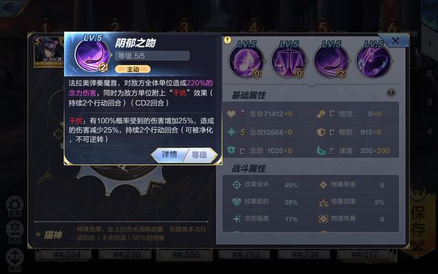 技能三,阴郁之吻全体伤害220%,同时为敌方附上干扰效果,持续2个回合。干扰:100%受到伤害增加25%,造成伤害减少25%,可被净化不可逆转。说白了就是BUFF,伤害很少就是意思一下,不过还是不错的,可以为前期伤害不高的情况减轻负担,拖延战机,就是需要两费。前期能量一定要稳住。技能四,使用乐器的友方斗士使用技能后会留下一个音符,当友方存在两个以上的不同音符时,拥有音符的斗士会进入共鸣状态。共鸣:共鸣状态下的友方斗士,提升30%的双防和30%的攻击,并且当一个共鸣状态下的斗士释放技能后,其余共鸣状态的斗士有30%的概率释放主动技能不含普攻,每回合最多释放三次,共鸣不可驱散。这个技能可以说是法拉奥的主要技能,配合奥路菲中后期可以一唱一和,打出不错的伤害,慢慢灭掉对方。
