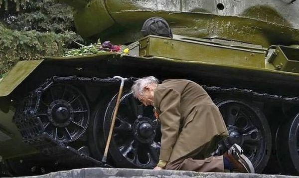 ▲T34坦克的老将跪在曾经的座驾前长跪不起,或许他在怀念曾经的战友,那段逝去的峥嵘岁月。