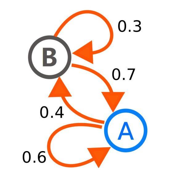 厕所 A 比较受欢迎,在所有到厕所 A 的人里面,下一时刻有 60% 的人会选择——就是你了,不管怎样都要排队等候。而还有 40% 的人可能因为人太多等原因选择另外一个厕所。厕所 B 则不那么受欢迎,在所有到厕所 B 的人里面,只有 30% 的人选择继续等候,剩下 70% 的人要溜。