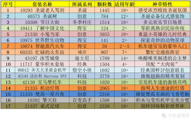 为便于大家比选,楼主梳理了17款乐高积木的概要信息一览图,名称、系列、颗粒数、适用年龄等一目了然,更有精简提炼的种草特性,让大家选购时事半功倍、便捷直达。