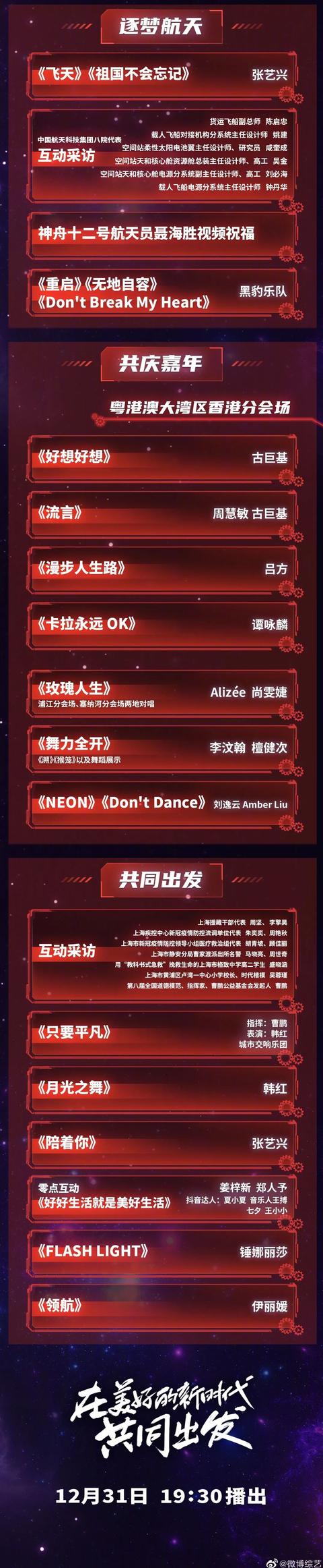 导读就在今晚(2021年12月31日)将有七大跨年晚会一起播出跨年演唱会节目单登上热搜第一详细播出时间和阵容在这里你选哪个央视启航2022跨年晚会直播时间:2021年12月31日晚20:00嘉宾