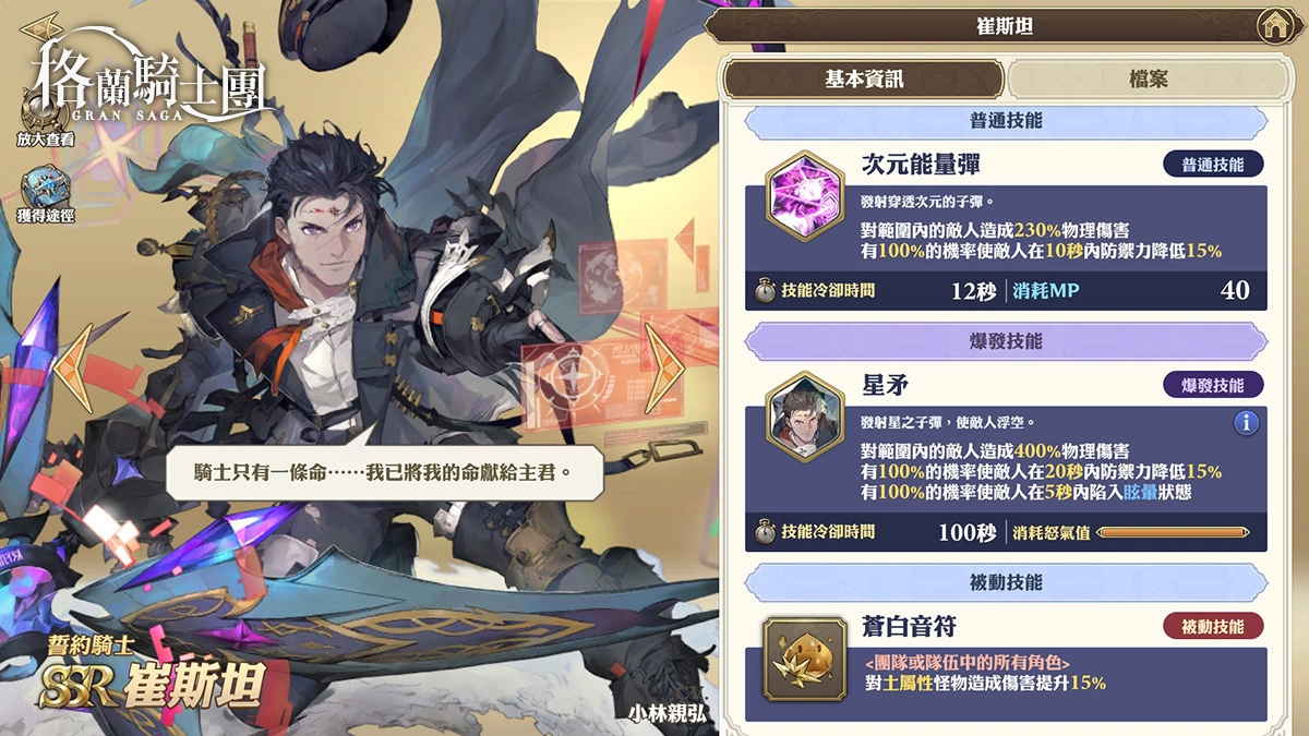崔斯坦:娜玛莉专属格兰武器,对範围内敌人造成物理伤害,并降低敌方防御力;被动技能是全队成员对土属性敌人造成伤害提升。