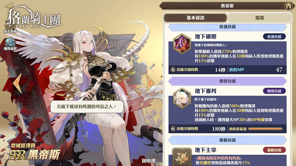 黑帝斯:卡特专属格兰武器,对敌方造成物理伤害,并赋予敌方物理伤害所受伤害增加;被动技能则是全队成员对光属性敌人造成伤害提升。