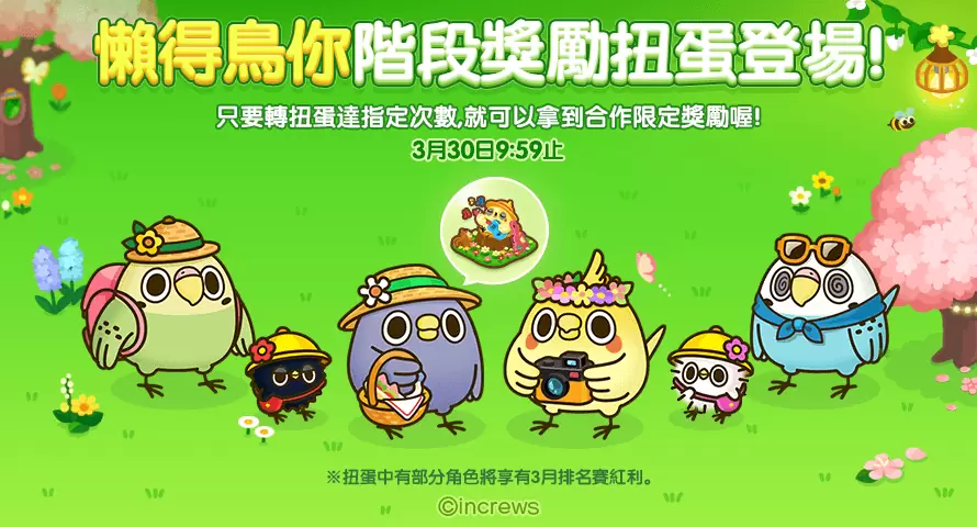 活动期间内登场的扭蛋中将会出现包括「春天远足懒得鸟」、「春天远足秀吉」、「春天远足松田」等本次合作的限定小伙伴。依照扭蛋的次数还可以再获得额外奖励,最终阶段的奖励为「春天远足直白妹」小伙伴,大家快来把这些可爱的合作小伙伴带回自己的农场,一起享受鸟语花香的春天!
