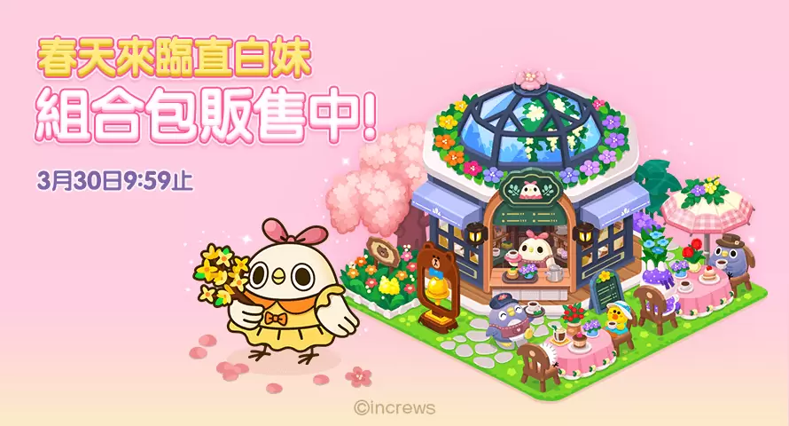 这次合作活动推出了特别组合包,内含「春天花朵直白妹」小伙伴和可以改变「熊大的家」房屋外型的「房屋造型」道具,另外还包括一张「合作限定精选扭蛋券」,在活动期间使用此扭蛋券时,小伙伴出现的机率与「懒得鸟你」阶段奖励扭蛋相同,每人限购1组,千万别错过!