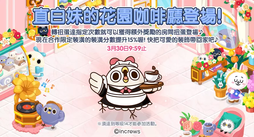 透过「直白妹的花园咖啡厅」房间阶段扭蛋可以获得熊大农场房间里的装潢配件,并且依照扭蛋次数还可以获得额外的奖励。活动期间合作限定的装潢可以提升15%装潢分数,邀请农友们一同来打造绿意盎然的花园咖啡厅!