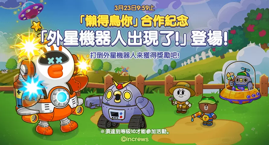外星机器人入侵农场了!请在限制时间内快速连续点击游戏画面就能打倒外星机器人,并可依据累积的伤害数值来获得特别道具,把「懒得鸟你」的小伙伴设置在辅助栏位中,可以提升对外星机器人的攻击力!跟着懒得鸟你一同打倒外星来的神祕机器人!