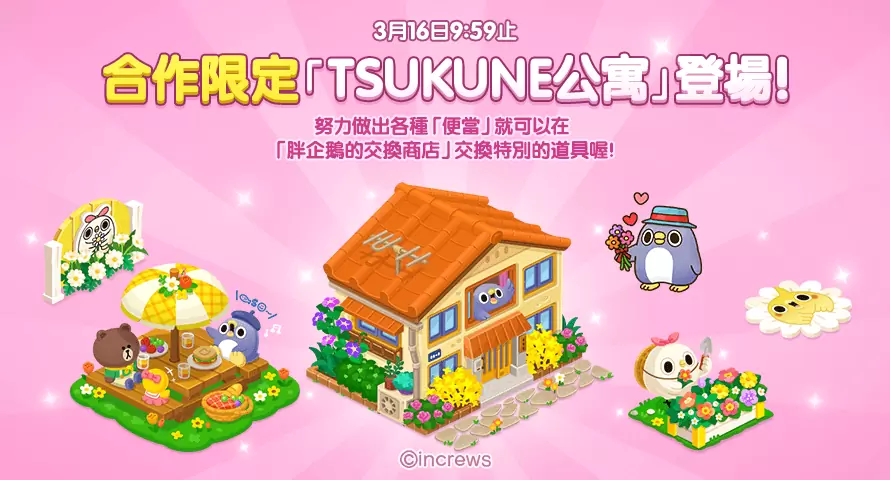 「TSUKUNE公寓」期间限定登场!只要製作出各种便当就可以到「胖企鹅的交换商店」来兑换特别的合作道具。把「懒得鸟你」小伙伴设置在栏位中,还能够让小伙伴使用能力来帮忙生产,农友们一起来蒐集超可爱的小伙伴与装饰吧!