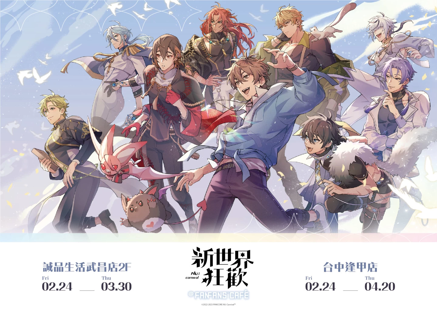 BL 手游《新世界狂欢》与 FANFANS CAFÉ 合作,庆祝游戏週年推出主题餐厅,于今天(2/24)正式开幕。台北西门武昌诚品二楼店面也以新装亮丽登场,现场放满眷属们的等身立牌,还特别以揭幕方式公开今天才解禁的一週年主题视觉图。