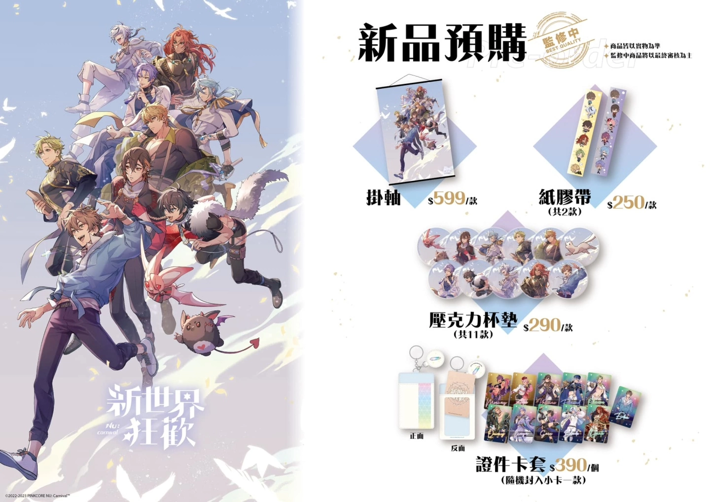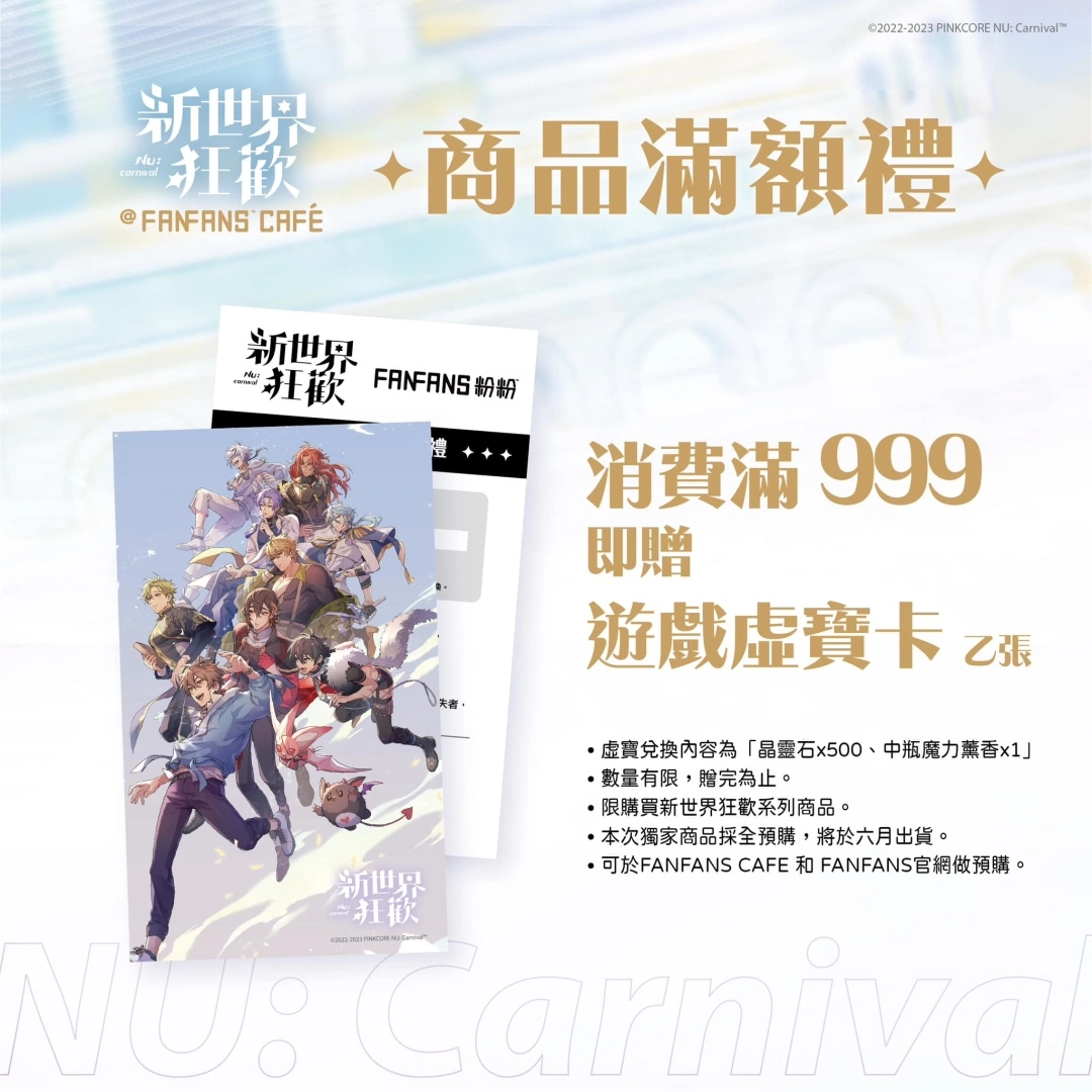 週边商品这次採用不限量全预购制,目前解禁的商品品项有:挂轴、纸胶带、压克力杯垫、证件卡套等,满额还送虚宝卡!希望各位喜欢《新世界狂欢》的玩家们,都能在这次的线下活动中创造开心的回忆!