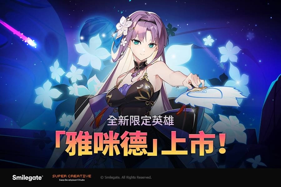 全新英雄「雅咪德」是 5 星级别的寒气属性精灵师英雄。她的所有技能皆拥有能使自身或是我军攻速值提升的效果,可以快速获得回合及更多的攻击机会。其中特别的是,第 3 技能「希望之手」能解除指定我军的 2 个弱化效果,并产生「速攻」及「攻击力增加」,使攻击力最大化。「速攻」是能在回合结束时,使速攻值提升 50% 的强力强化效果。