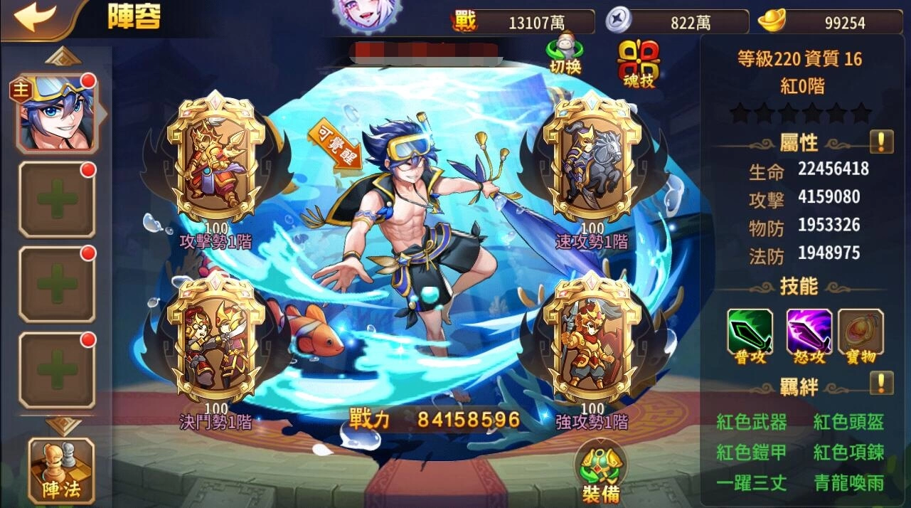 当获得100彩金能量时,每次普攻会额外获得10点怒气值,同时普攻大幅提高自身暴击伤害1回合;怒攻时,提前降低敌方血量最低武将防御值,回复等同伤害量的生命值,并恢复怒气。彩金技:累积100彩金能量后攻击 2 次,降低敌方全体武将防御 30% 一回合