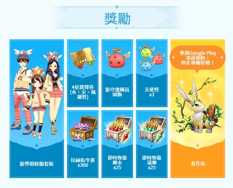 目前《魔灵召唤:克罗尼柯战记》事前预约仍如火如荼地进行中,参加官网事前预约可获得时尚可爱的校服时装及丰富的虚宝;Google Play商店预注册还能加码获得超萌坐骑「春花兔」。