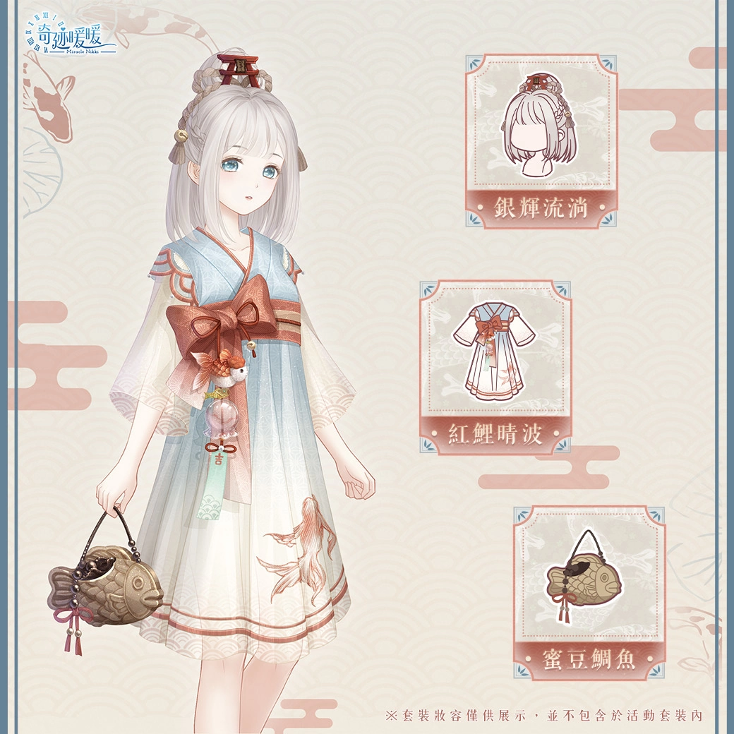 在本次活动中,每个限定部件首次获得时,搭配师可额外获得「唤鲤串铃*1」;获得重複部件时,重複部件将转化为一定数量的「跃鲤气泡」。搭配师使用「唤鲤串铃」及「跃鲤气泡」可兑换「衿袖池鳞」限定散件,包含髮型「银辉流淌」、连衣裙「红鲤晴波」与手持「蜜豆鲷鱼」,以及钻石、星光币等多种奖励!