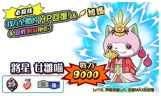 在女儿节特别活动期间,游戏中除了释出节日特别活动与限定妖怪──将星男雏喵与将星女雏喵外,也同步开放限时妖怪转蛋与军魔神祭典转蛋──赏月编(2月23日~3月16日13:59)。在这和风佳节里,各位将军们快来收集并组合出最强喵怪战队吧!