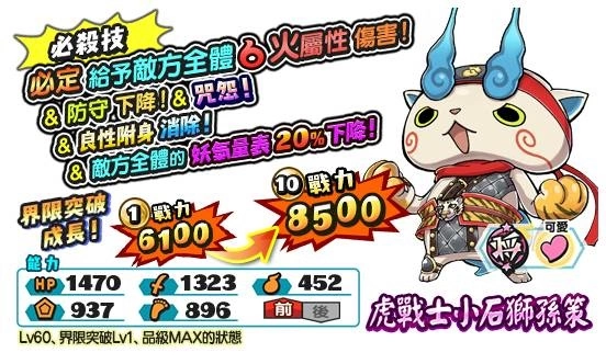 ‧限时妖怪转蛋:虎战士小石狮孙策除了必定给予敌方全体火属性伤害外,低必杀技量与必中攻击等等效果,让小石狮孙策在妨害敌人与攻击都是很有利的武将!