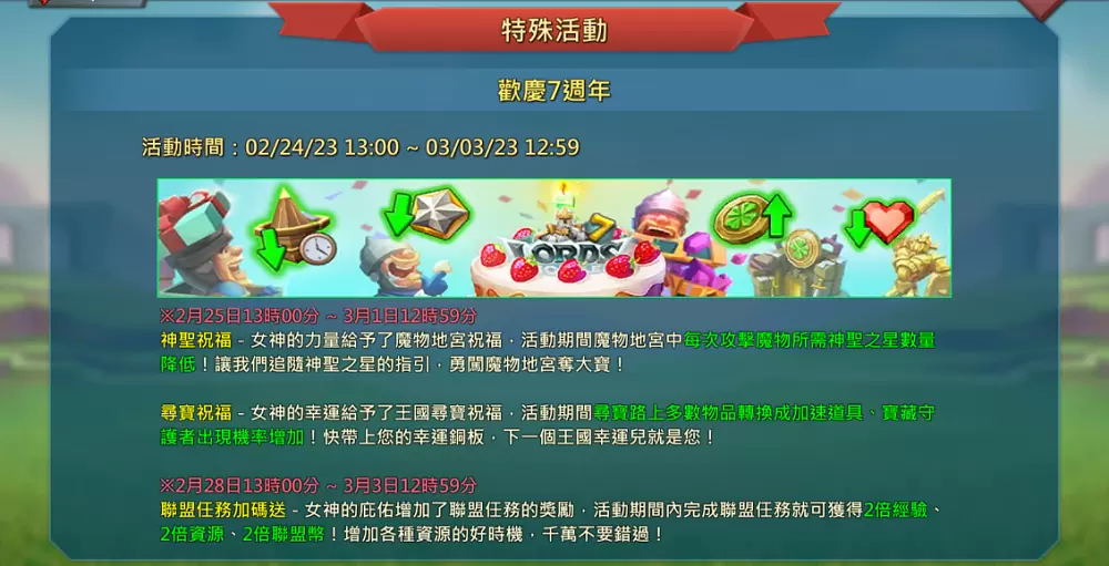 在週年庆典里,自然少不了回馈玩家的各种游戏福利!从 2 月 24 日开始,《王国纪元》7 週年庆典系列活动开始相继上线。从加码的登入福利、到开启 BUFF 加成的炼金/冒险/寻宝/地宫,再到世界首领活动和 3 倍联盟任务奖励等,福利一波接一波。无论你是喜欢热血对抗的集结强者,还是种田发育的休闲派,都可以找到最适合自己的方式,轻鬆获得海量福利。