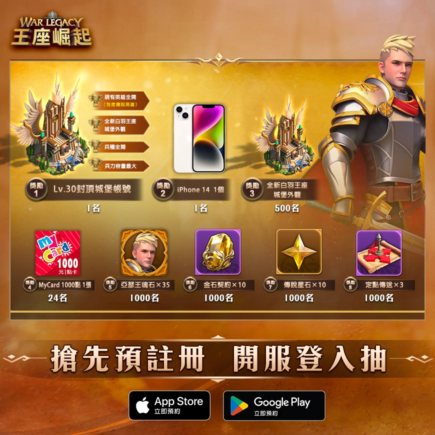 为庆祝《王座崛起》双平台预注册开启,官方独家举台湾限定活动,现在只要于完成双平台预先注册,并于游戏上市时登入游戏,就有机会抽中最新 iPhone 手机等豪礼,更有机会抽中超级大奖:解锁游戏中所有英雄,以及城堡外观白羽王座的「Lv.30封顶城堡帐号」,让你一开服就在王座之上,享受赢在起跑点的真实快感!