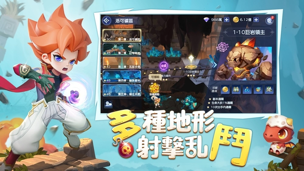游戏内拥有多地图关卡以各类秘境、遗迹副本:从洛克矿区、伊甸林地到瓦瑟沙漠、禁闭丛林......玩家可以在不同的地形上灵活使用各种武器弹射战斗,配合隐身、飞行、追蹤多种技能,每一场战斗都能带给玩家愉悦的攻击感!
